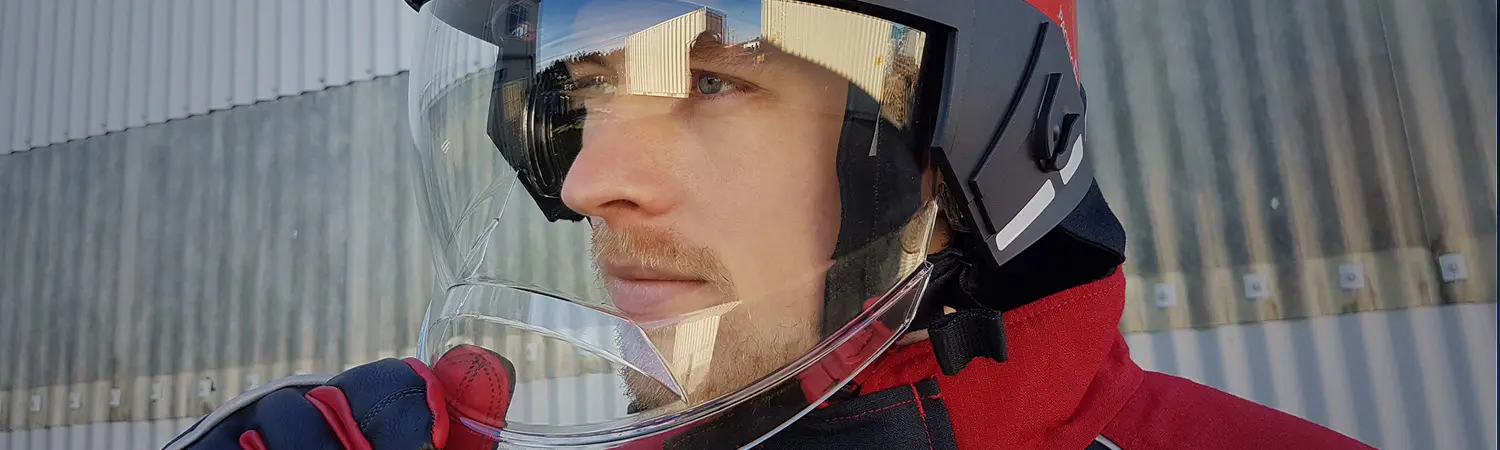 Wewnętrznie zamontowana przyłbica osadzona na podwójnych mocowaniach Dual Pivot zapewnia ochronę przed cząstkami stałymi o dużej prędkości oraz stanowi barierę przed wysoką temperaturą i podmuchy płomieni. Wykonana z ognioodpornego poliwęglanu pokrytego powłoką odporną na zarysowania i zaparowanie.